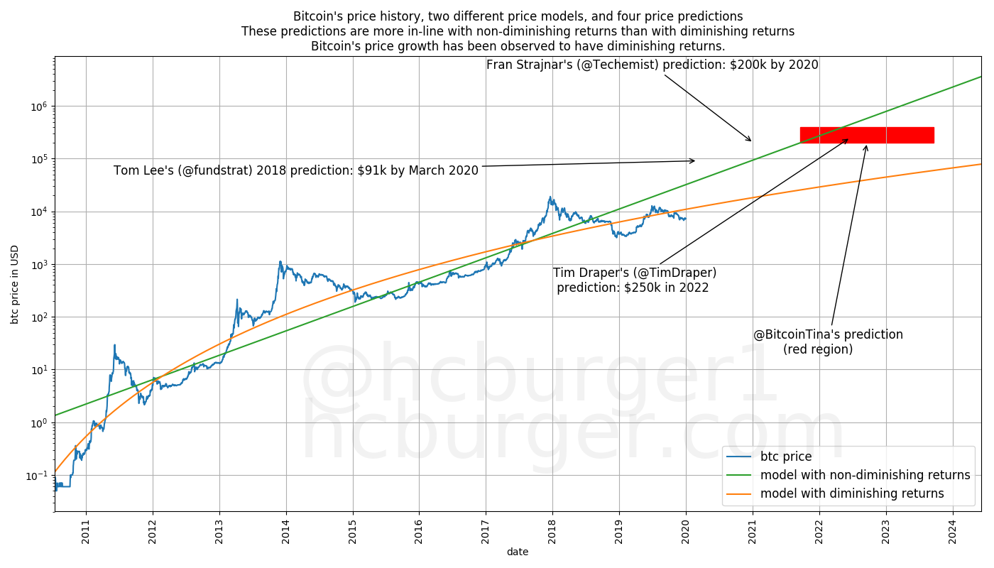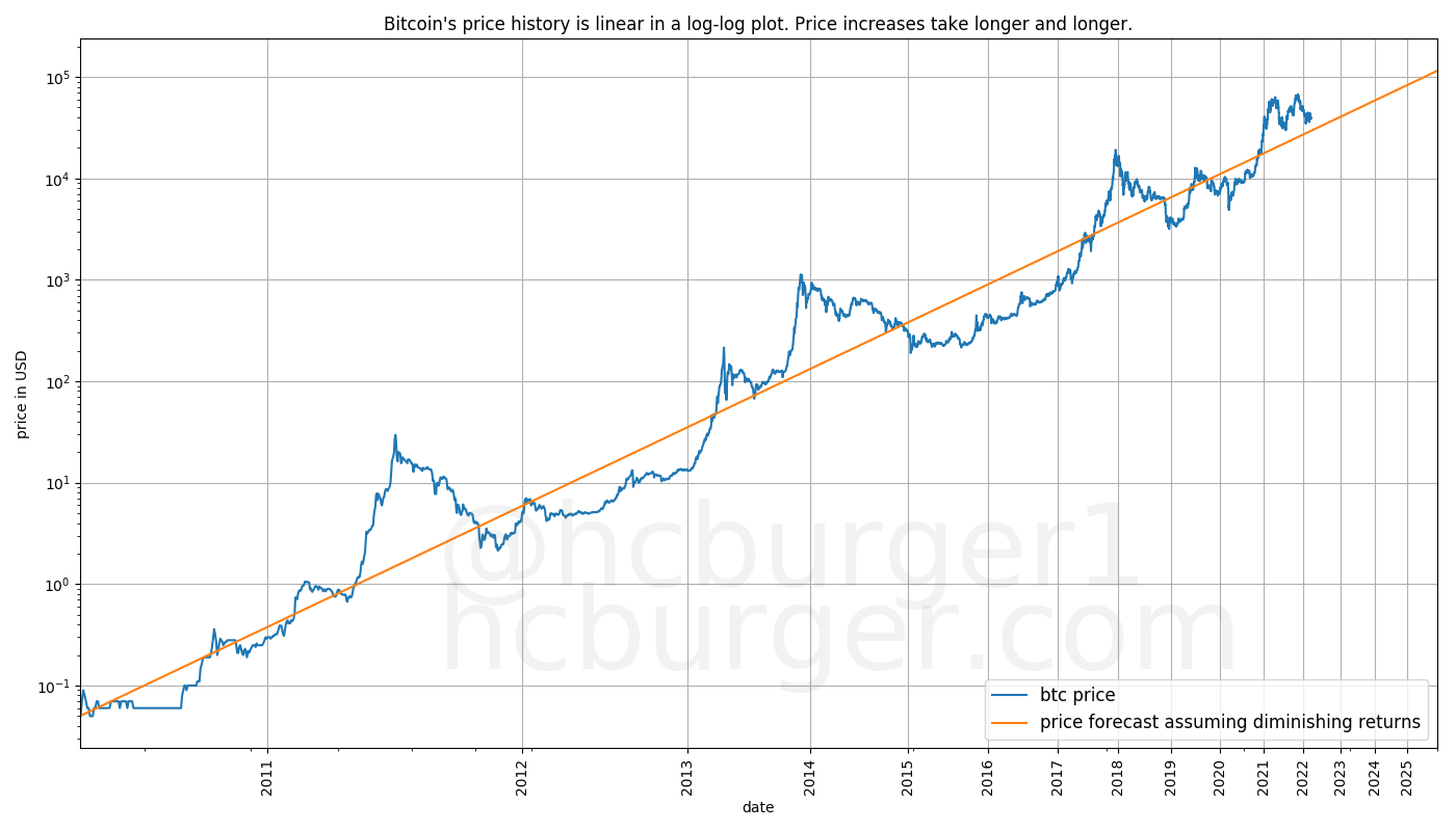 Yet, many people seem to assume that bitcoin’s price will behave similarly in the future as it did in the past. In other words, they expect price increases to happen at the same pace as in the past. I have published the below plot in an article at the end of 2019. Various people have made predictions apparently based on the assumption of non-diminishing growth (roughly represented by the green line). I predicted that these forecasts would prove to be too bullish, and that the price would more closely follow the orange line, which is governed by diminishing returns.