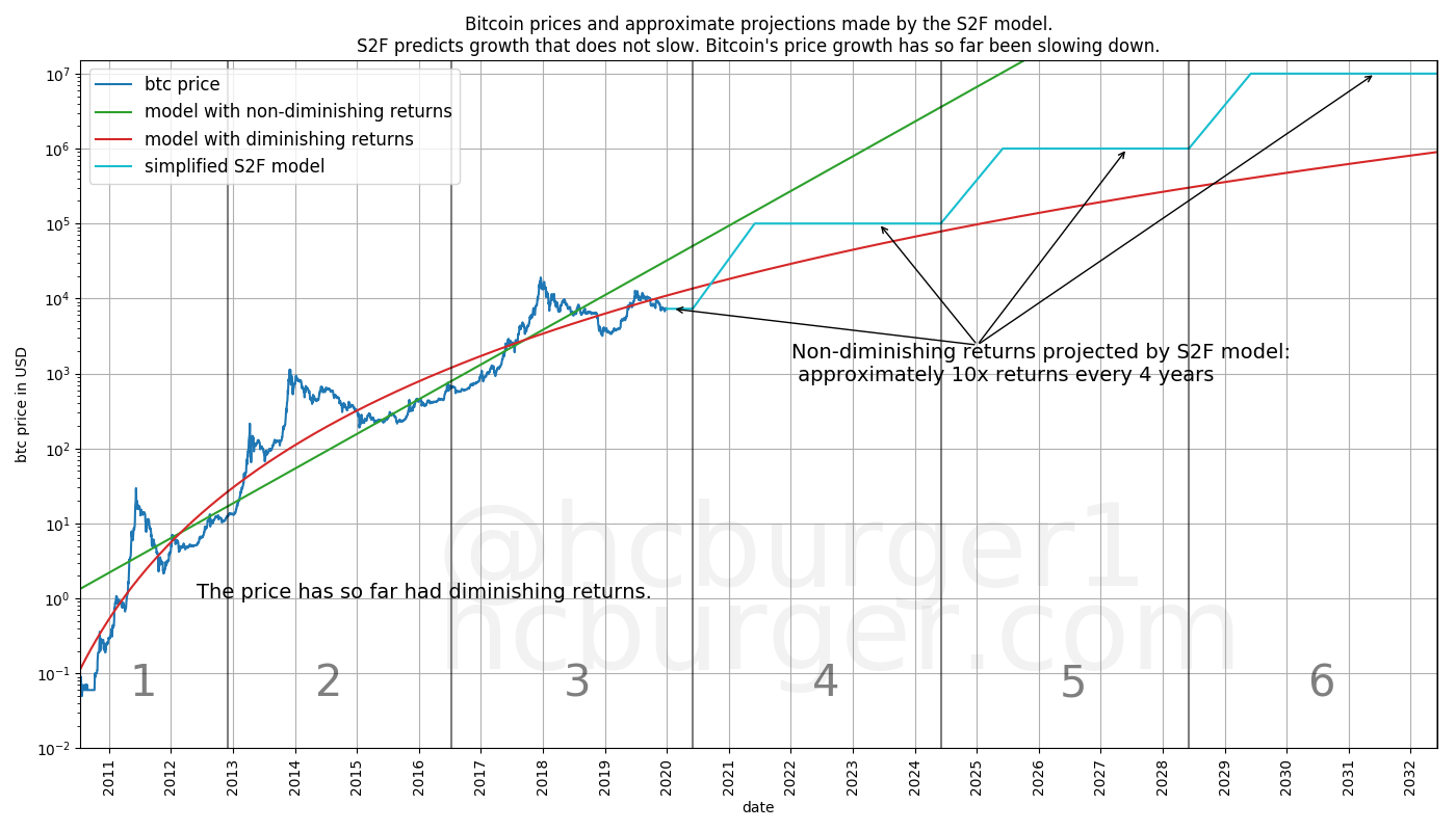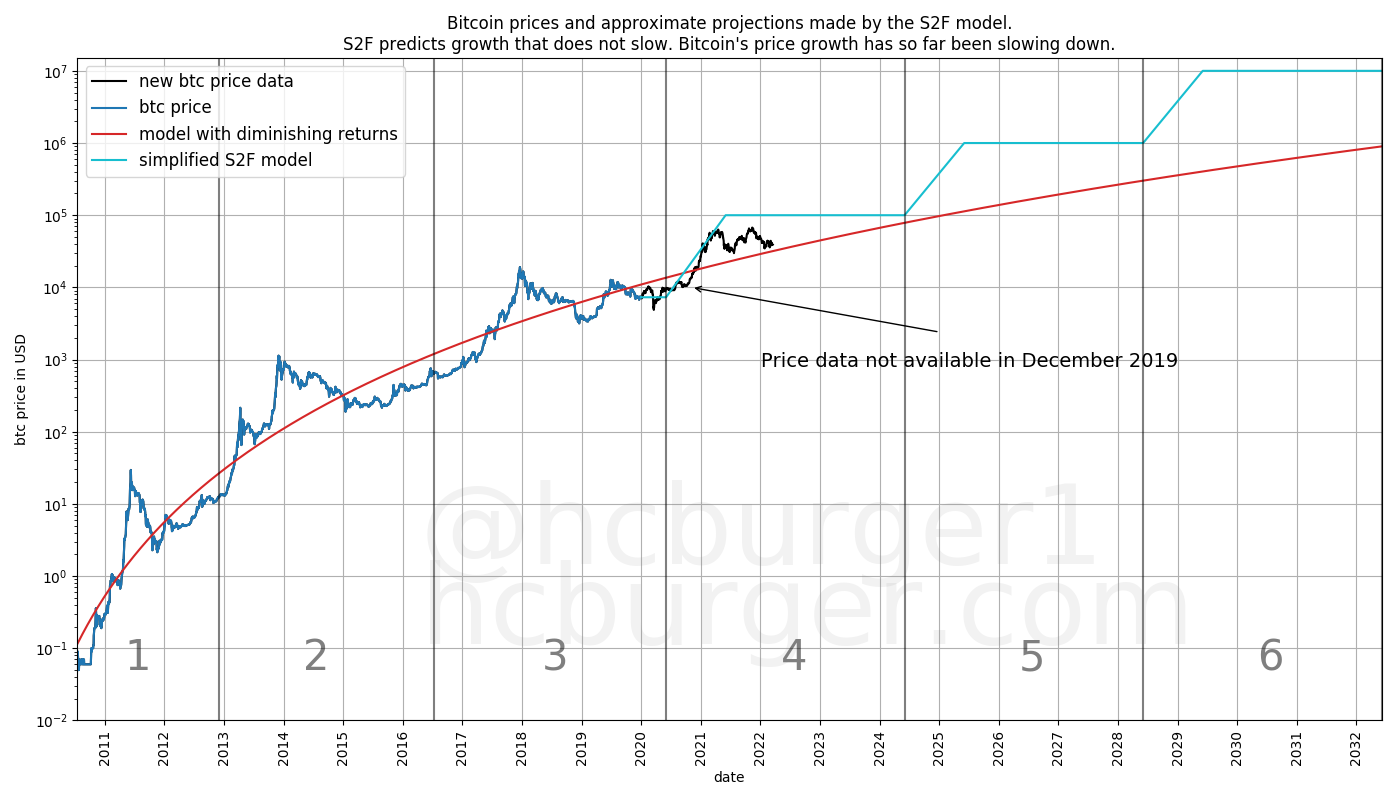 Again, it would appear that bitcoin’s price more closely follows a trajectory with diminishing returns. I therefore expect the price to move further and further away from the S2F forecasts in the long term.