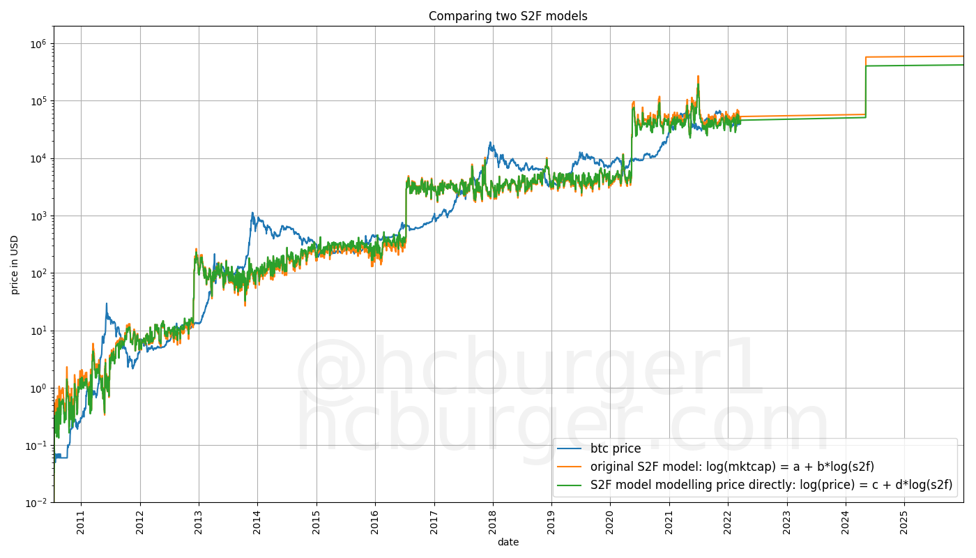 We see the two models are extremely similar to each other. There is no enormous difference in the quality of fit between the two models. Hence, even if there were a tautology in the original S2F formulation (there isn’t), the point would be quite trivial, since it would not materially matter. The model could be re-written to approximate price instead of market cap and the result would be almost identical.