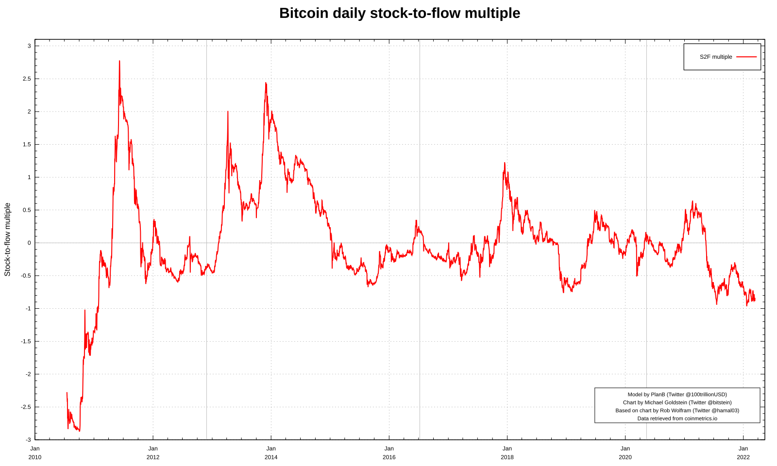 The popular Twitter handle s2fmultiple tracks how the price is performing compared to the S2F forecasts. The metric is referred to as the S2F multiple. A multiple greater than 0 means that the price is higher than the S2F multiple, and vice versa.